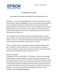 Epson Robots, the #1 SCARA robot manufacturer in the world, announced that it signed FPE Automation, a full-service, award-winning, stocking distributor of premier components for industry, as an official distributor for the full line of Epson Robots automation products. This includes Epson SCARA, 6-Axis and many other industrial automation products offered by Epson Robots. The distribution will cover the State of Illinois, Eastern Missouri and Eastern Iowa.